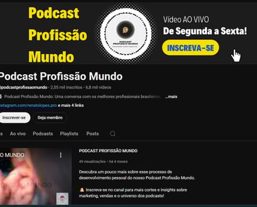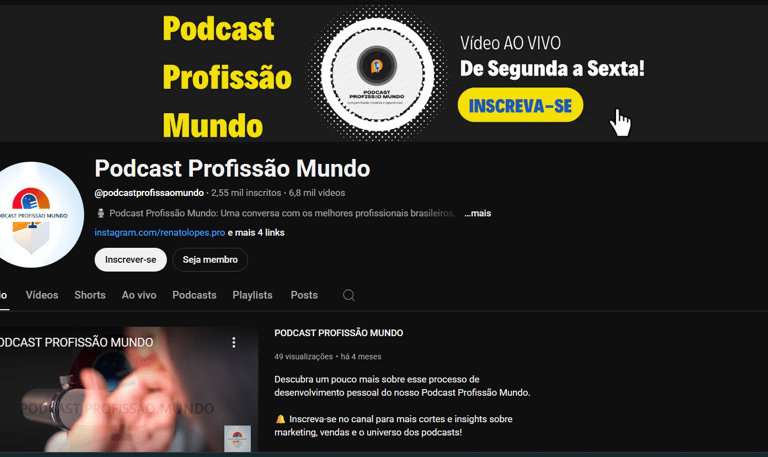 🎙️ Podcast Profissão Mundo: Uma conversa com os melhores profissionais brasileiros, portugueses e angolanos sobre empreendedorismo, vendas, marketing, tecnologia, criação de conteúdo e muito mais!🤩 Se você está procurando conselhos profissionais e estratégias de alto nível para alavancar seus negócios e sua carreira, o Podcast Profissão Mundo é o lugar certo para você.📢 Nossa missão é oferecer conteúdo educacional de alta qualidade e entrevistas com profissionais experientes para ajudar os nossos ouvintes a melhorar suas carreiras e alcançar seus objetivos.💪 Aqui você encontrará informações confiáveis de especialistas, conselhos de profissionais de sucesso e as últimas tendências do mundo dos negócios.💡 Se você está procurando por conteúdo educacional de qualidade que lhe ajude a melhorar suas habilidades profissionais e alavancar seus negócios, o Podcast Profissão Mundo é o lugar certo para você.